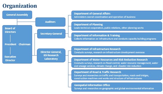 IDI’s purpose is contribute to international social development and to better, sustainable living conditions for people all over the world by participating in projects that promote international mutual understanding in the construction industry and contribute to economic and technical progress in developing countries, particularly with cooperation for the development, operation and maintenance of infrastructure. IDI was established in 1956, as a corporation under the jurisdiction of the Ministry of Construction (currently Ministry of Land, Infrastructure, Transport, and Tourism (MLIT)).