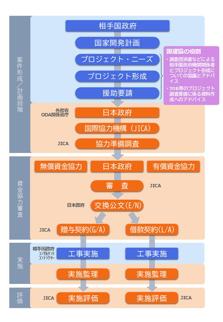 上図は開発プロジェクトにおける日本のODAの流れを概略を示したもので、必ずしも日本側の援助手続きや各機関の機能を全てを述べたものではありません。